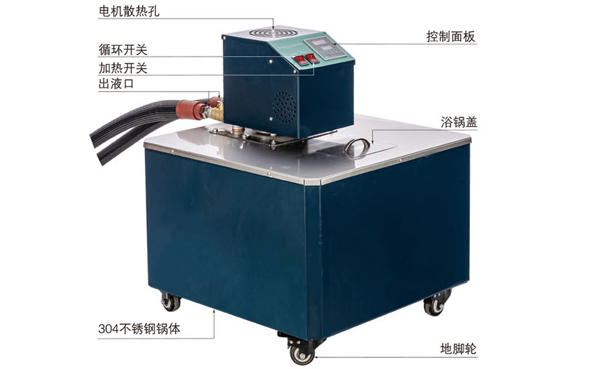 高溫循環油浴鍋采用進口不銹鋼板材料作內膽。外殼選用卜板靜電噴塑。電熱管將在油中間,加熱快、熱效高、耗電省、電子恒溫。我們還對產品的溫控系統進行改行,不論是數顯還是表顯,均增加了控溫裝置。油浴外殼與內膽內有隔溫棉保護,可供各種同型號高溫浴鍋。
